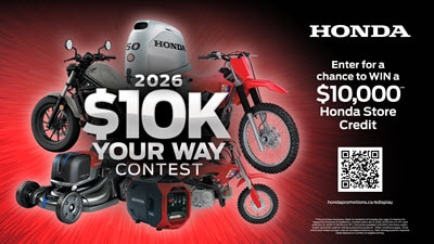 Redeem on Honda Motorcycle, ATV, SXS, Power Equipment and Marine. No purchase necessary. Visit Honda Promotions for rules.